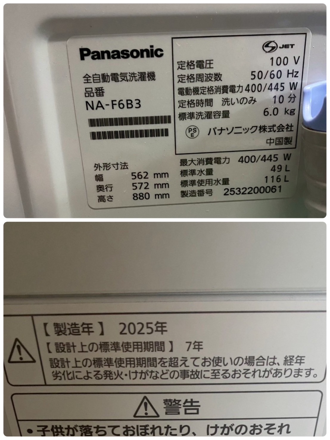 今回は「Panasonic(パナソニック)」の6.0kg洗濯機【型番:NA-F6B3・2025年製】を出張買取いたしました。