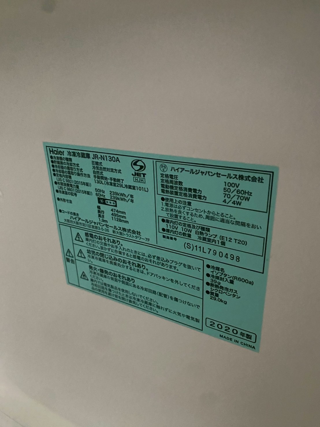 東京都板橋区のお客様からのご依頼で、Haier(ハイアール)2ドア冷蔵庫 JR-N130A 2020年製の出張買取いたしました。