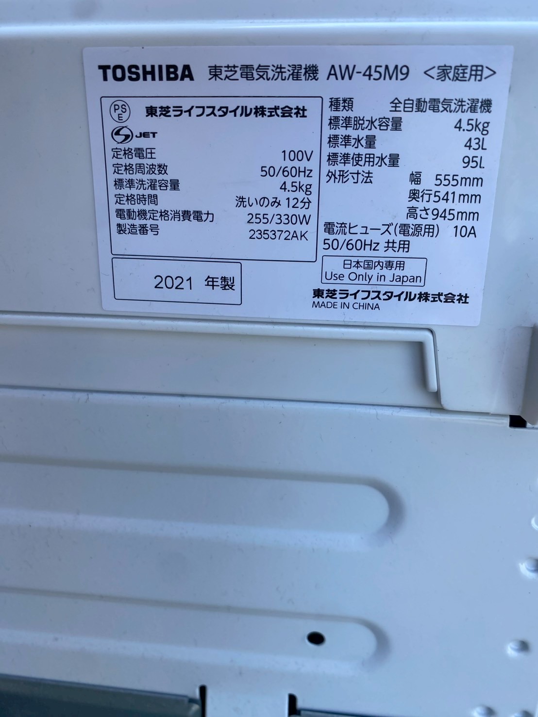 【2021年製】TOSHIBA(東芝)洗濯機 AW-45M9(W)を戸田市で出張買取しました!
