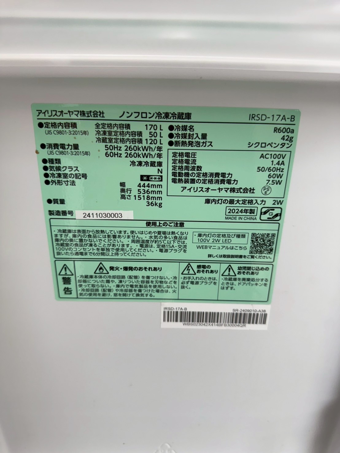 【板橋区 出張買取】IRIS OHYAMA 2ドア冷蔵庫 IRSD-17A-B 2024年製 を東京都板橋区で出張買取しました!
