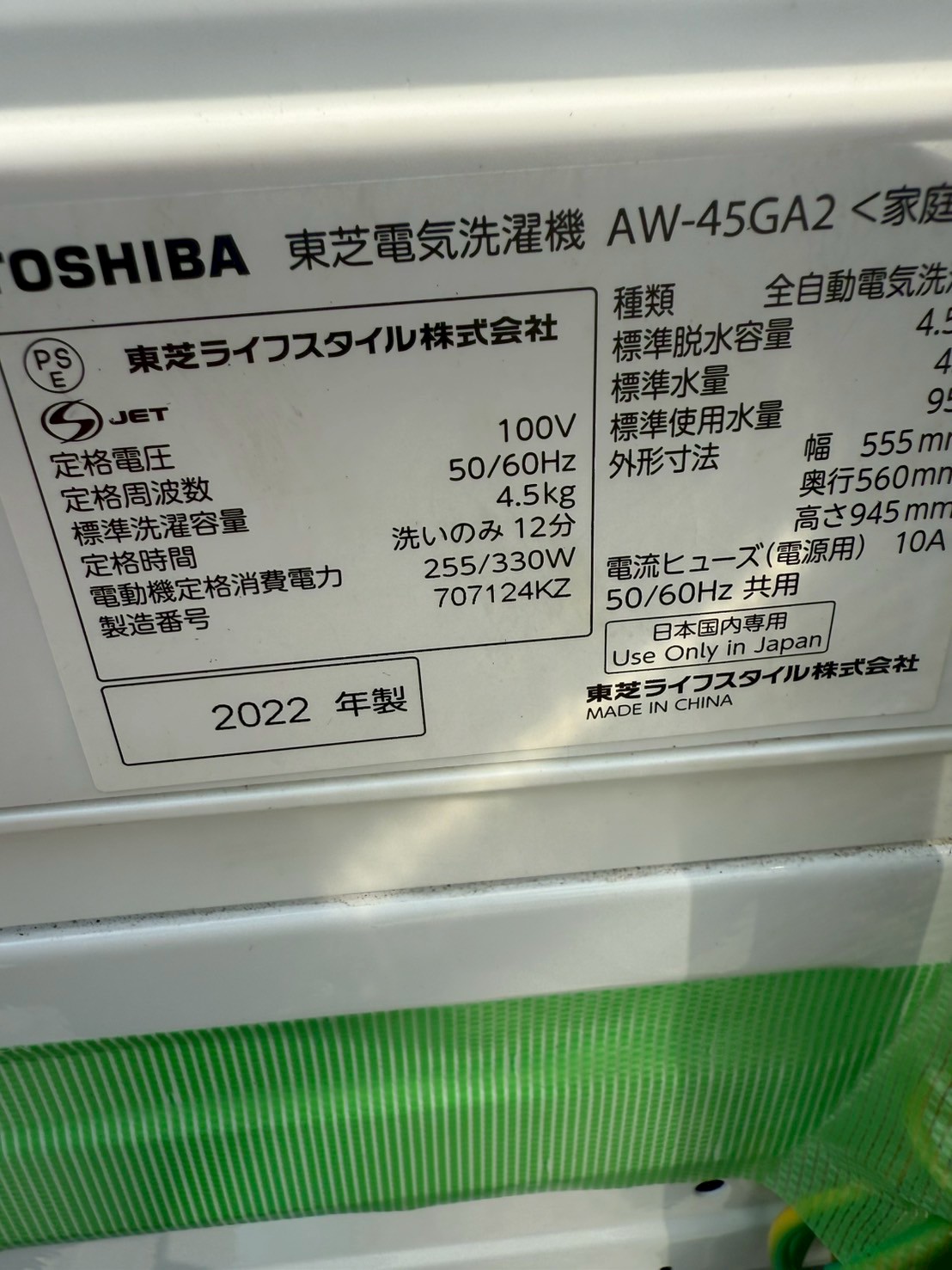 【埼玉県蕨市 出張買取】TOSHIBA製洗濯機 AW-45GA2(2022年製)を埼玉県蕨市にて出張買取!