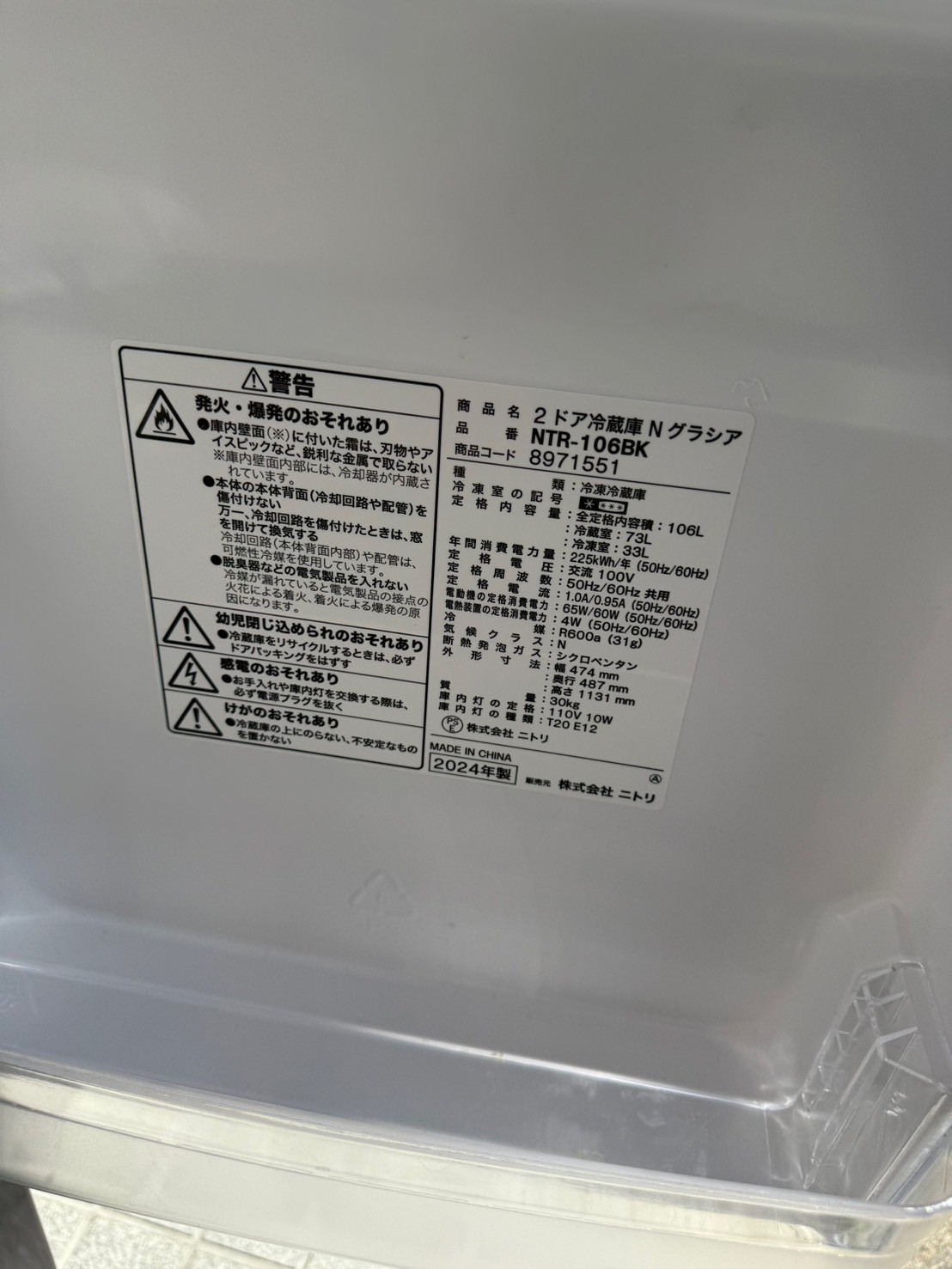 【東京都板橋区 出張買取】ニトリ 2ドア冷蔵庫 NTR-106BK 2024年製を東京都板橋区にて出張買取!