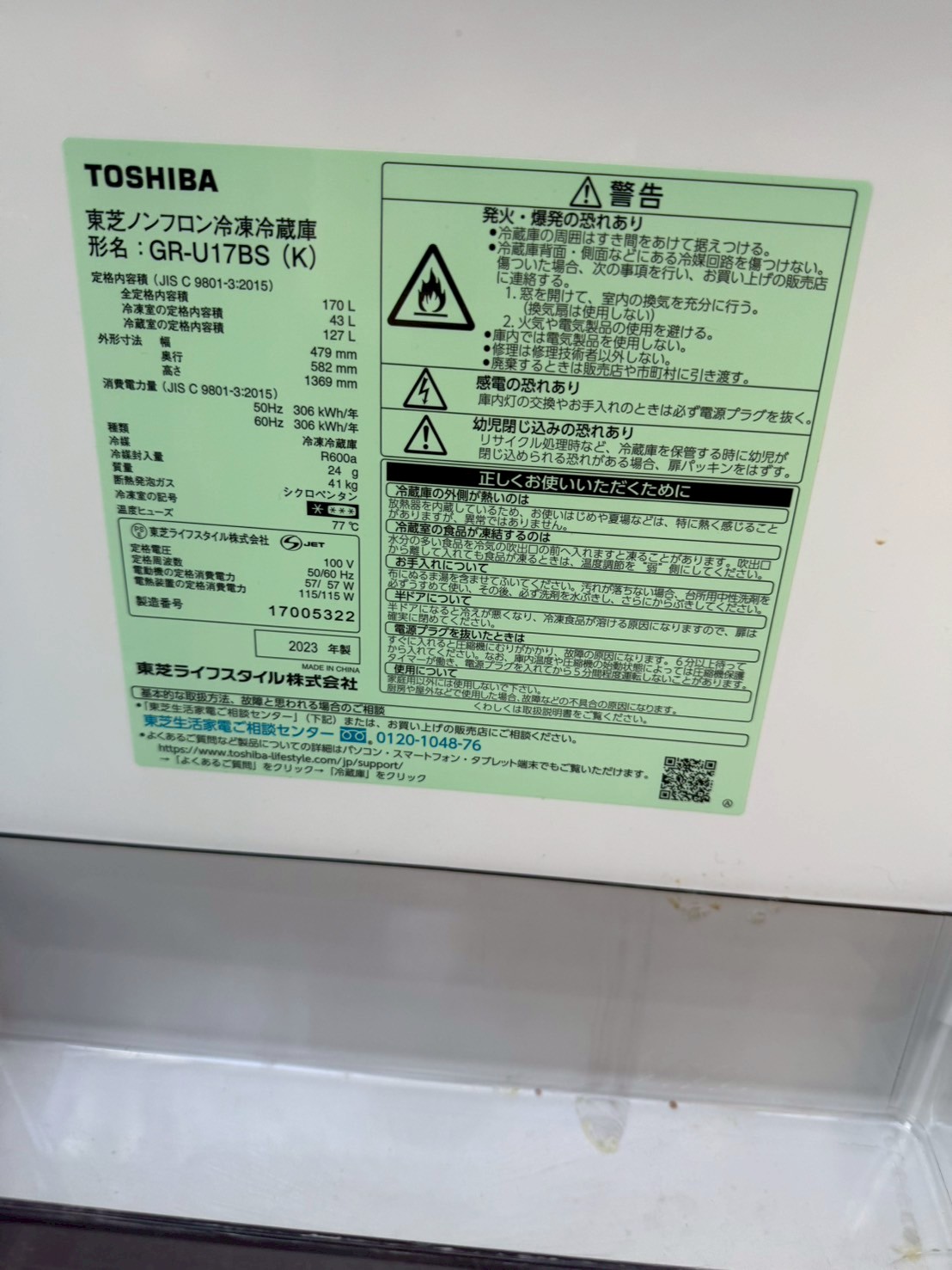 【出張買取実績 川口市】東芝 GR-U17BS(K)2023年製 170Lの2ドア冷蔵庫を出張買取!