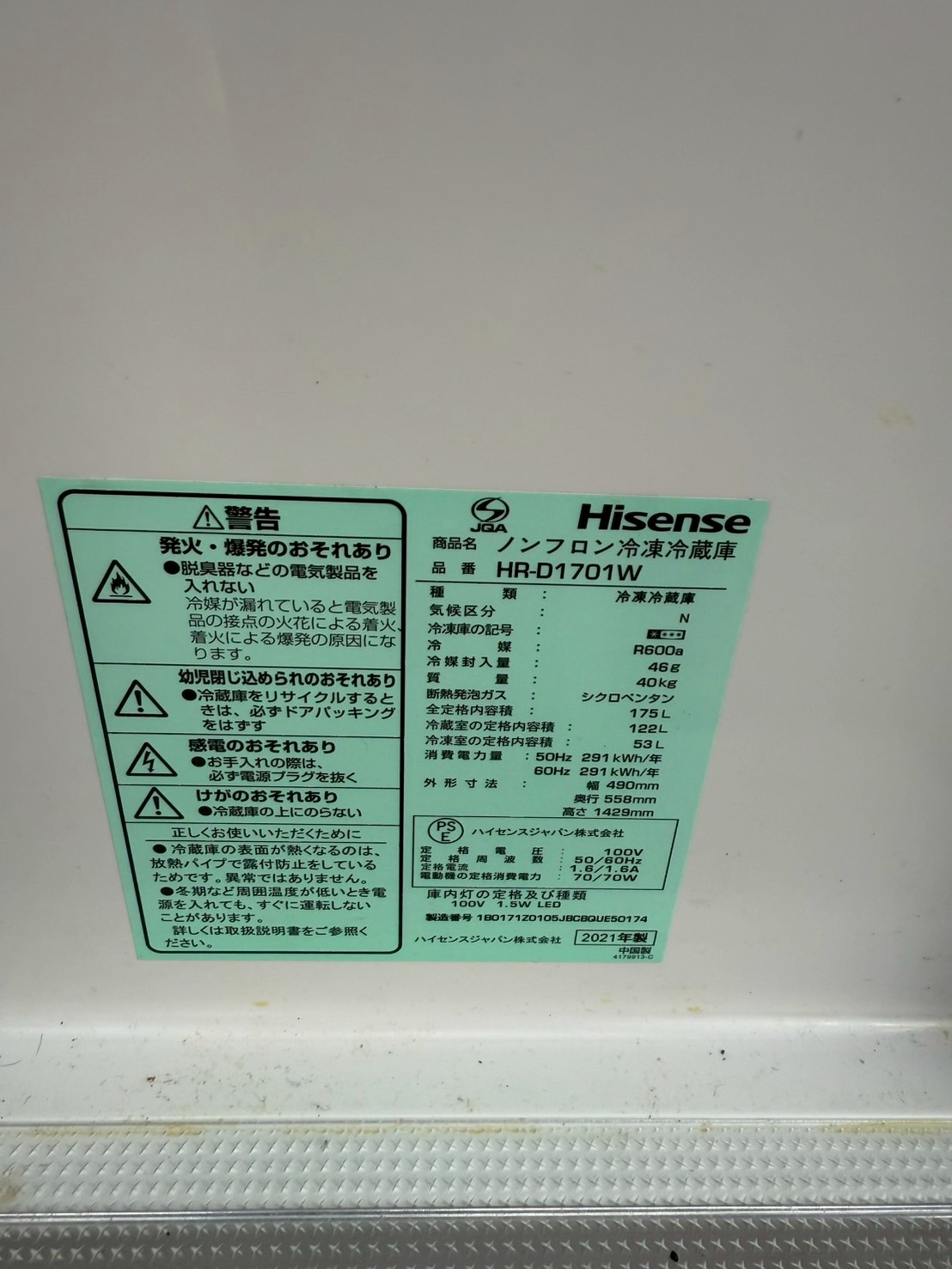 埼玉県川口市にてHisense 2ドア冷蔵庫 HR-D1701W 2021年製を出張買取