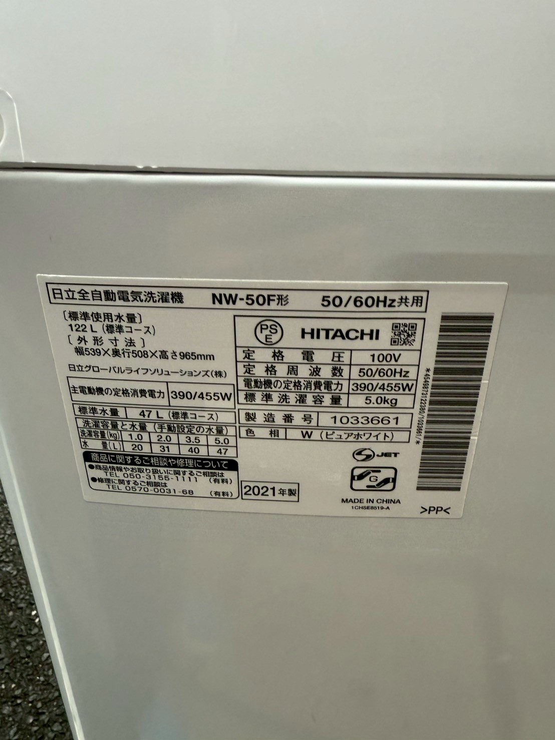 日立 洗濯機 5.0kg NW-50F 2021年製を出張買取 |埼玉県川口市 出取例