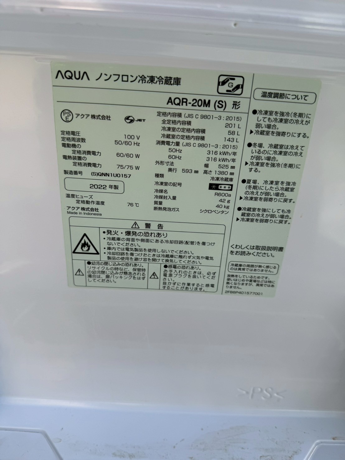 川口市でAQUA 2ドア冷蔵庫 AQR-20M(S) 201L 2022年製を出張買取|埼玉県 買取