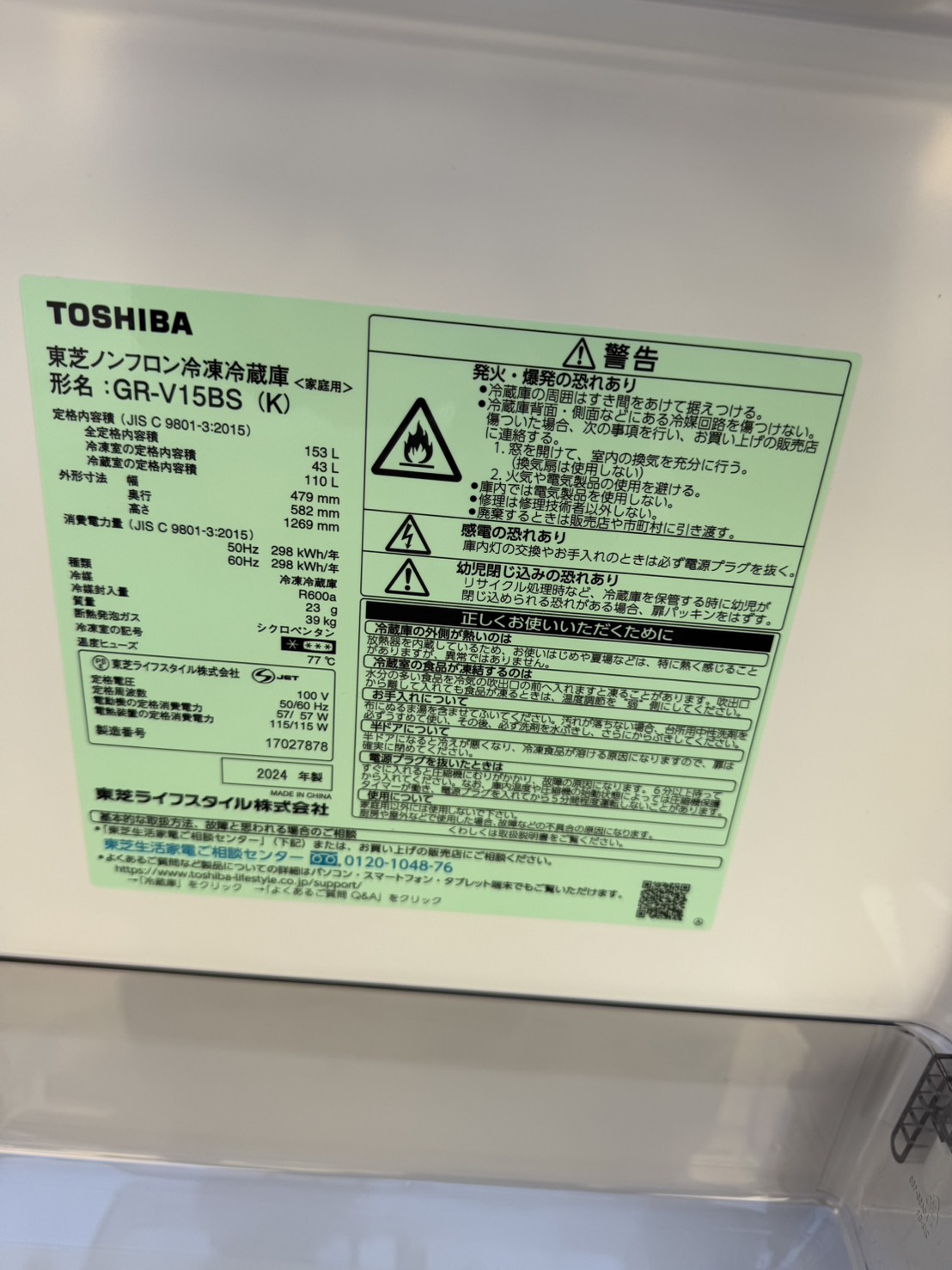 【川口市東川口 出張買取】美品のTOSHIBA 153L冷蔵庫 GR-V15BS(K) 2024年製 を出張買取