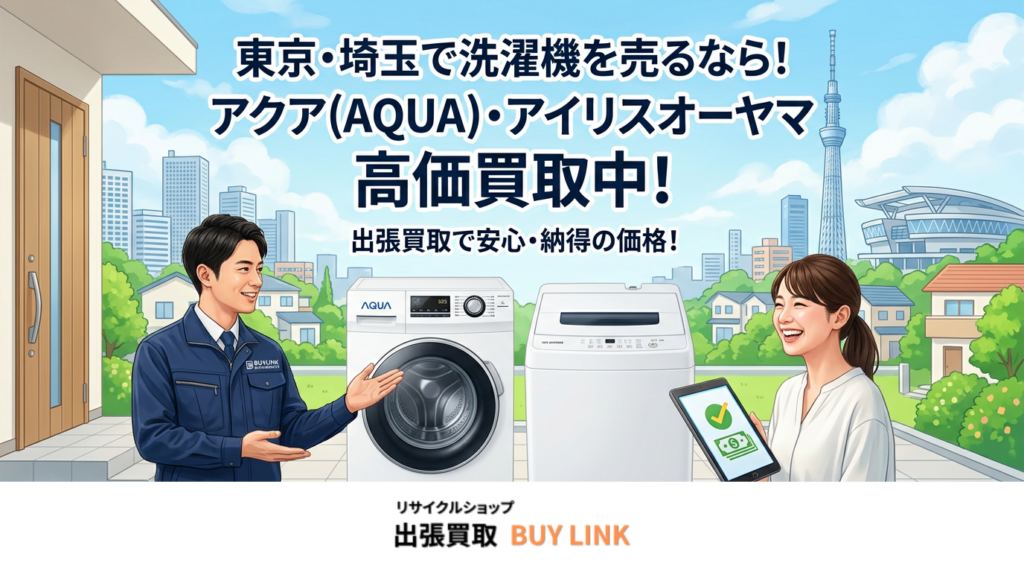 東京・埼玉でご不要になったアクア(AQUA)やアイリスオーヤマの洗濯機の売却をご検討中ですか?「出張買取は初めてで不安」「少しでも高く売りたい」とお考えなら、家電の出張買取を専門とするリサイクルショップBUY LINKにお任せください。