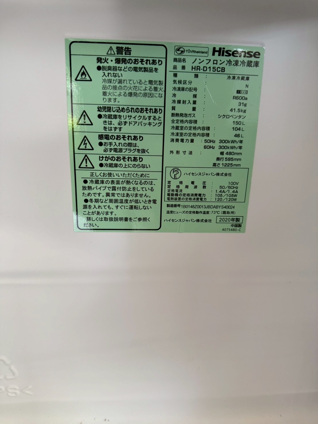 【2020年製】Hisense(ハイセンス)2ドア冷蔵庫 HR-D15CBを無料出張引取|埼玉県川口市